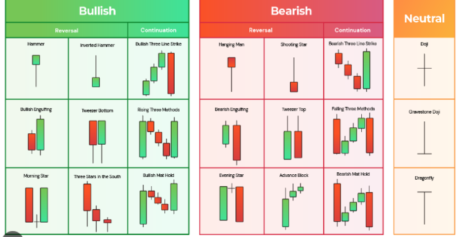 Morning Star: A three-candle pattern consisting of a long bearish candle, followed by a small body (either bearish or bullish), and then a long bullish candle.